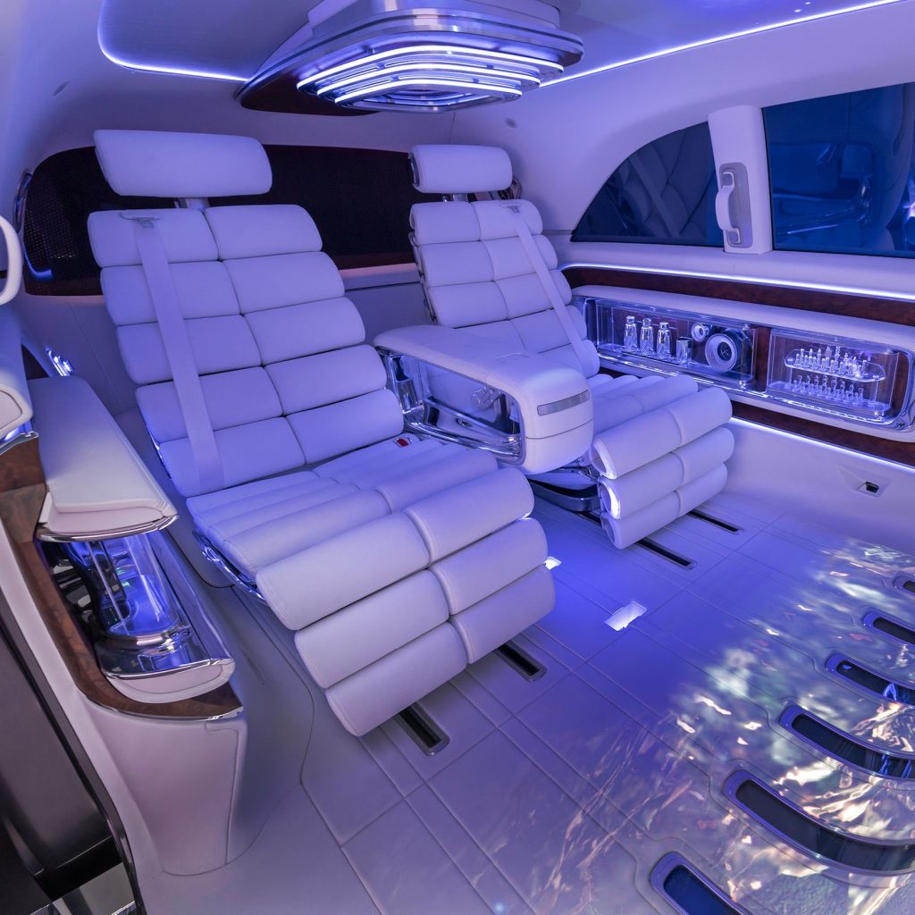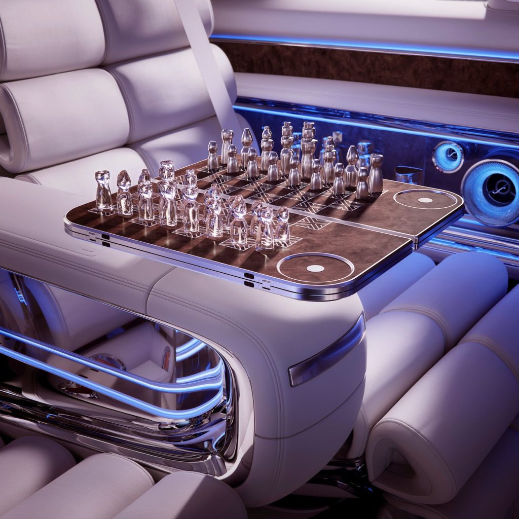 الجلوس داخل Vision V تجربة في حد ذاتها، حيث تتميز السيارة بمقعدين منفصلين مستوحَيين من مقاعد الدرجة الأولى في الطائرات. هذه المقاعد مكسوة بجلد نابا أبيض حريري الملمس مع لمسات من الحرير الطبيعي، وتتيح خاصية الاستلقاء التام لمن يبحث عن أقصى درجات الراحة. كما توفر الطاولة المركزية القابلة للطي لمسة من الفخامة العملية، حيث تتحول إلى رقعة شطرنج أنيقة تلبّي أذواق من يقدّرون التفاصيل الدقيقة.